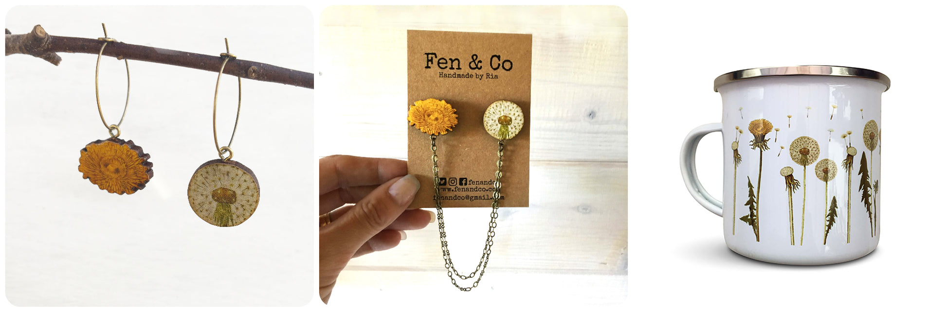Also available in my dandelion range are enamel mugs, collar pins and dangle earrings.