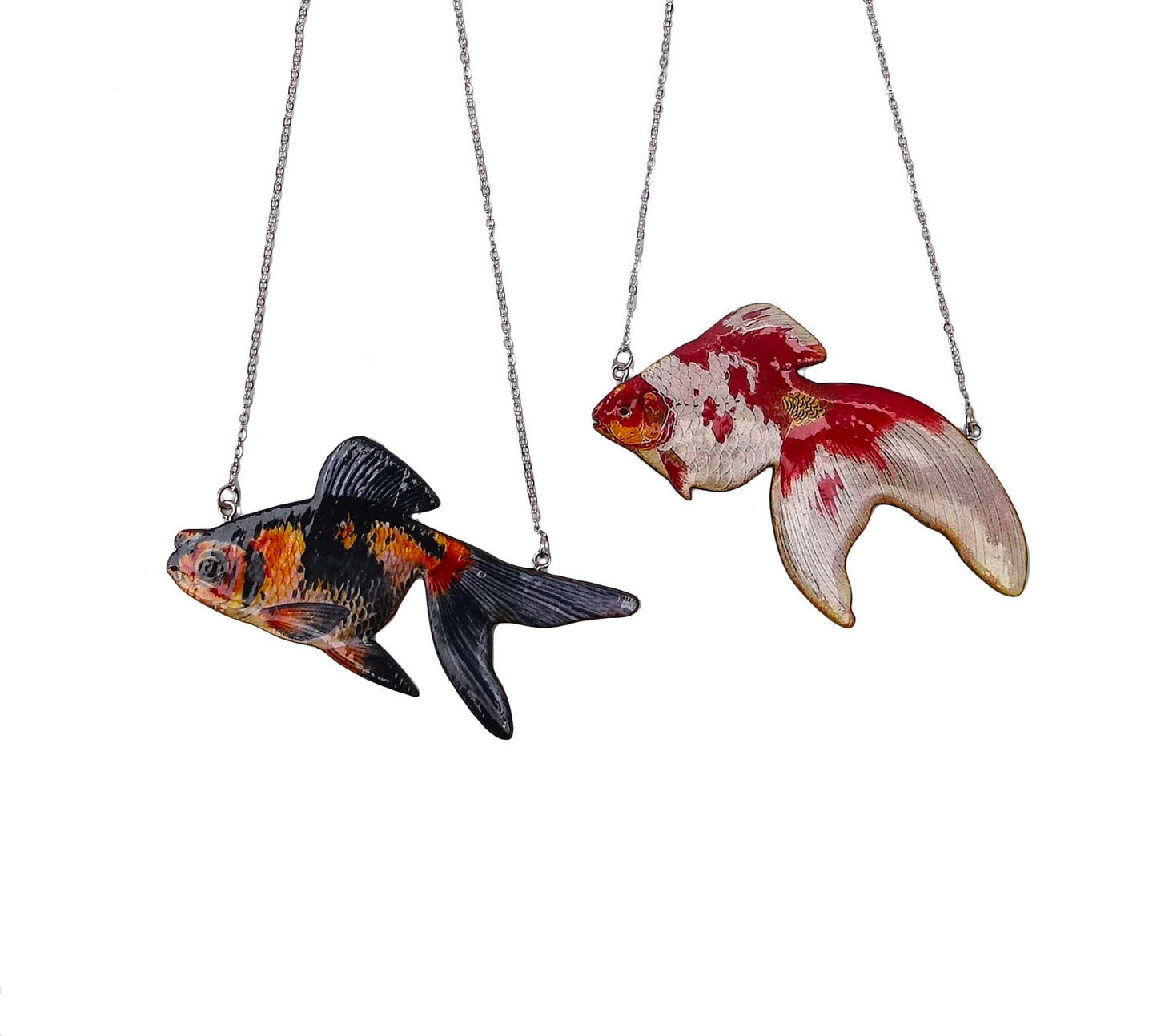 Fen & Co statement goldfish necklace handmade using sustainably grown Birch wood.
