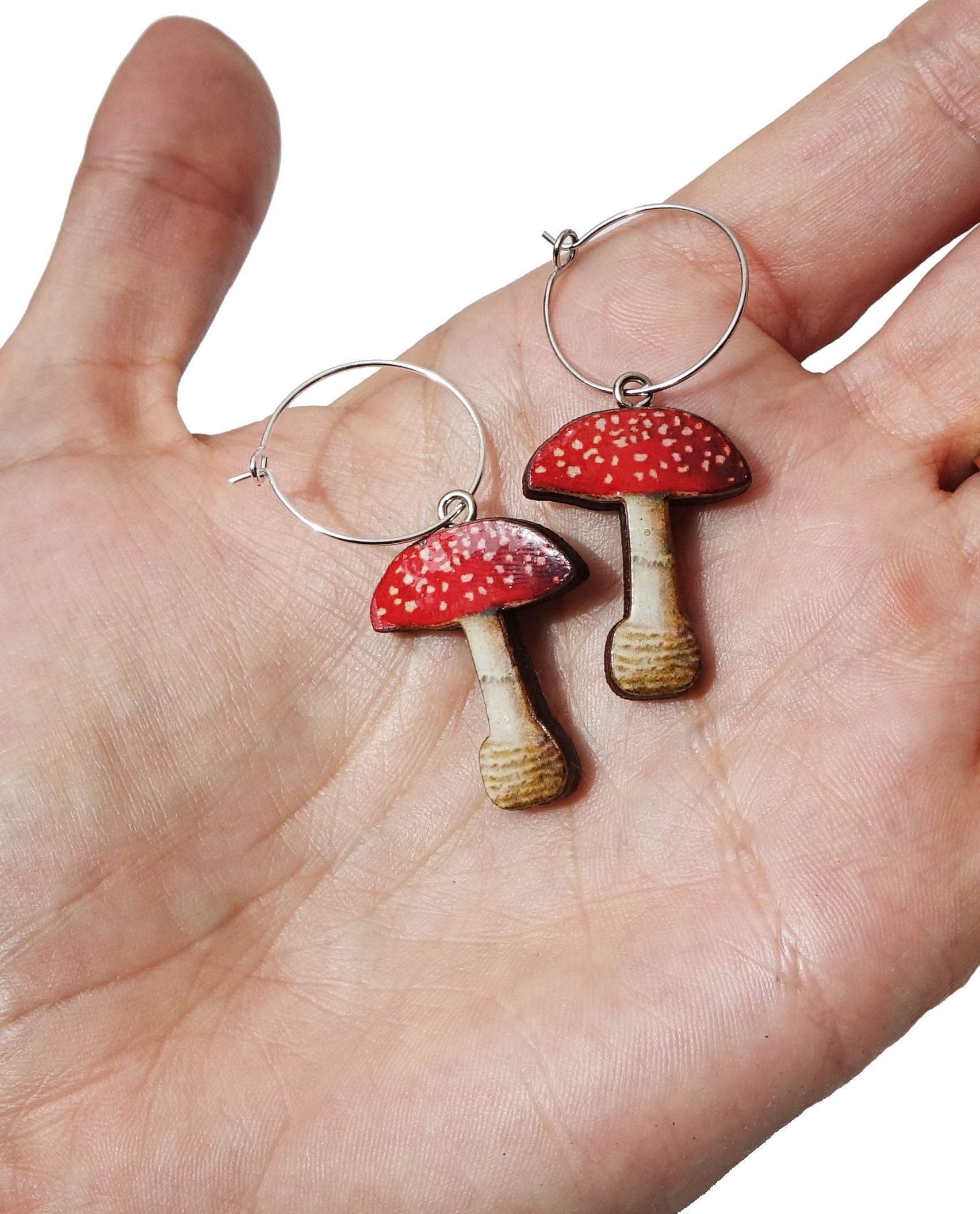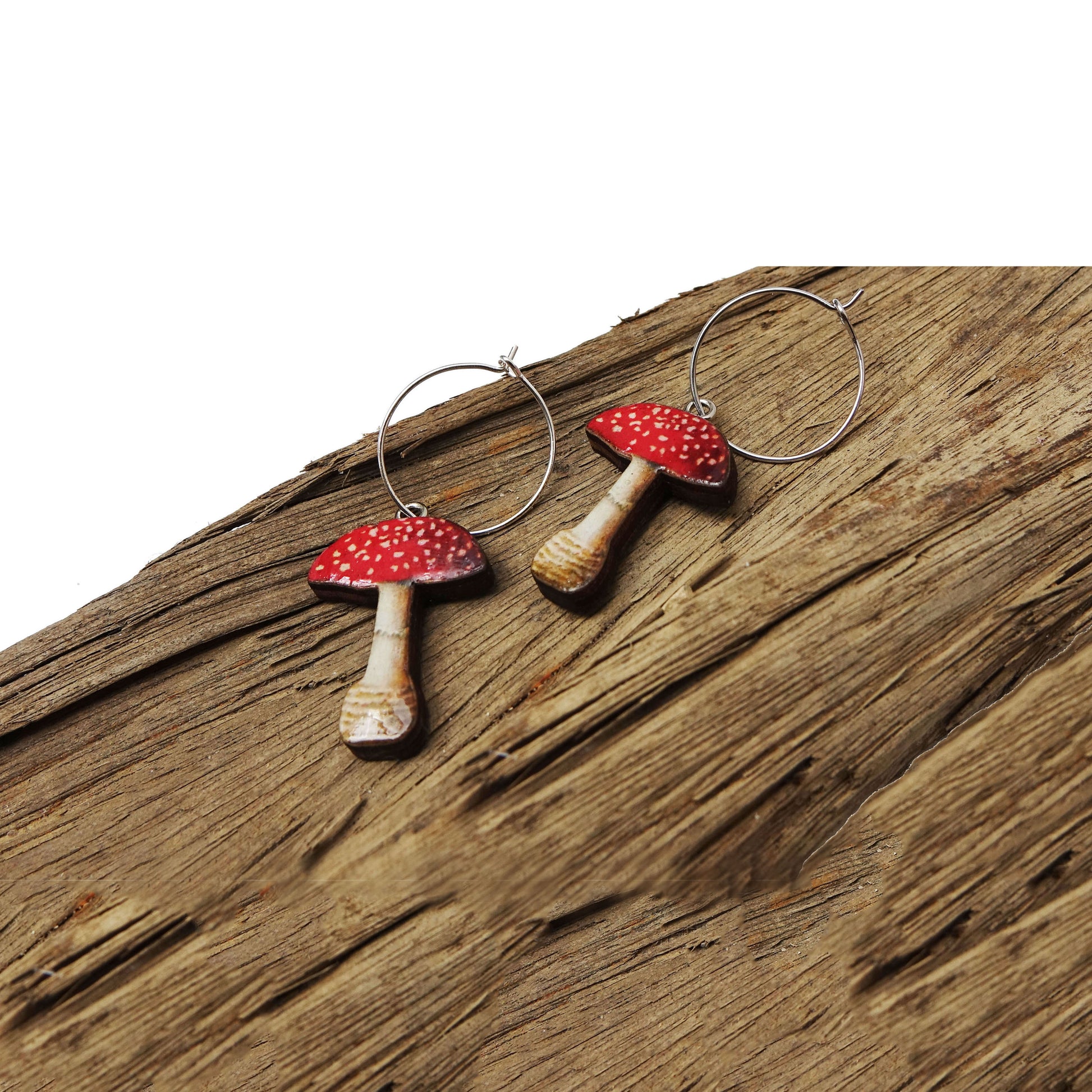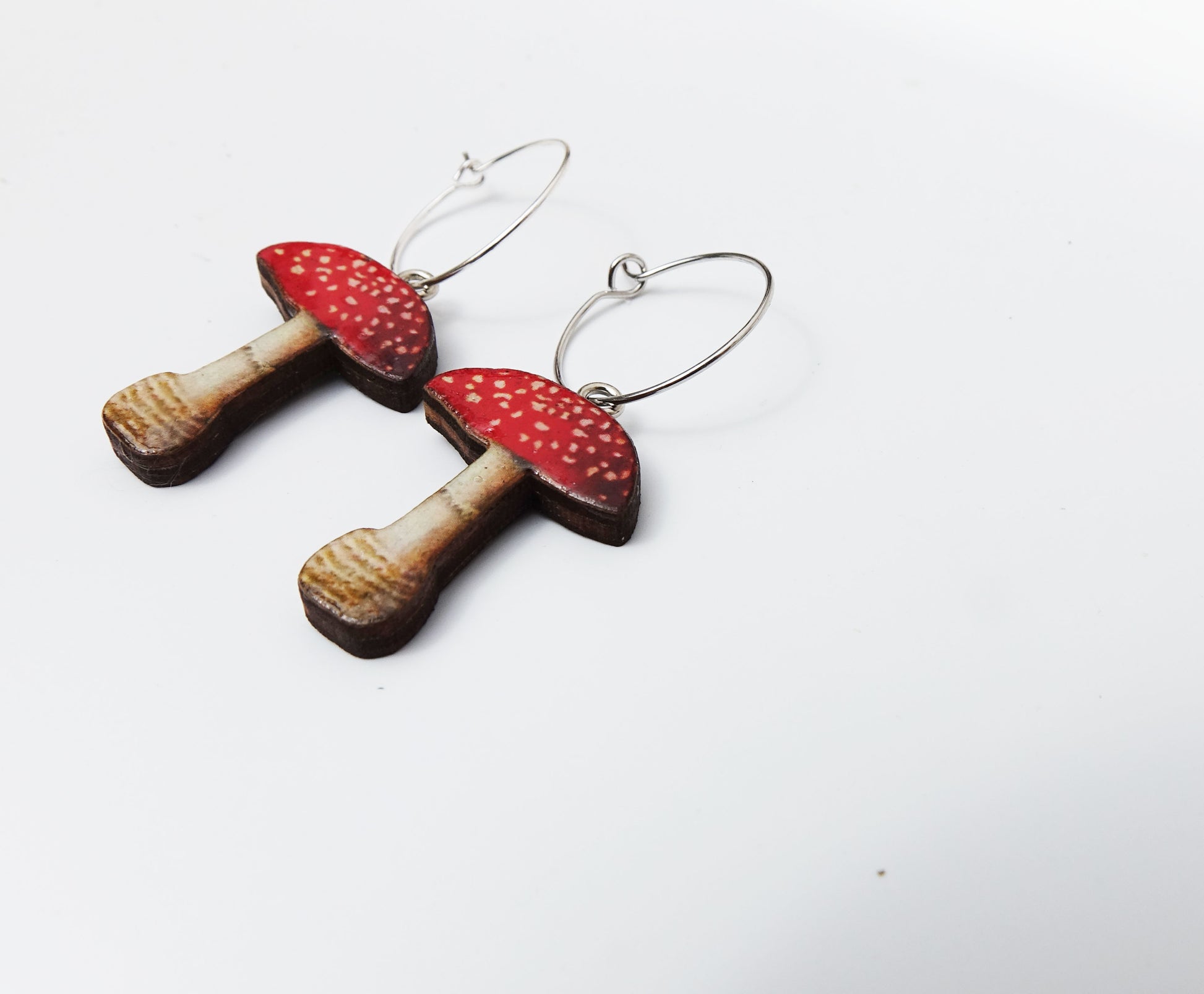 Super sweet Fly Agaric mushroom earrings handmade using sustainably grown wood.
