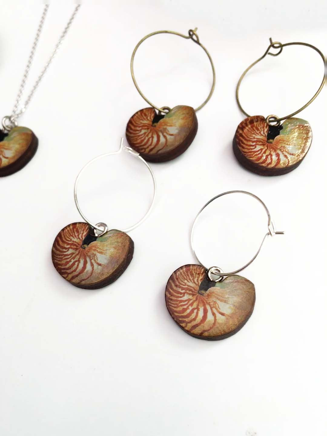 Fen & Co sweet little handmade Nautilus shell earrings or necklace. Each shell was originally an antique image now restored back to it's beautiful detail and colour and lasered on sustainably grown wood.These are little works of art for your ears!
