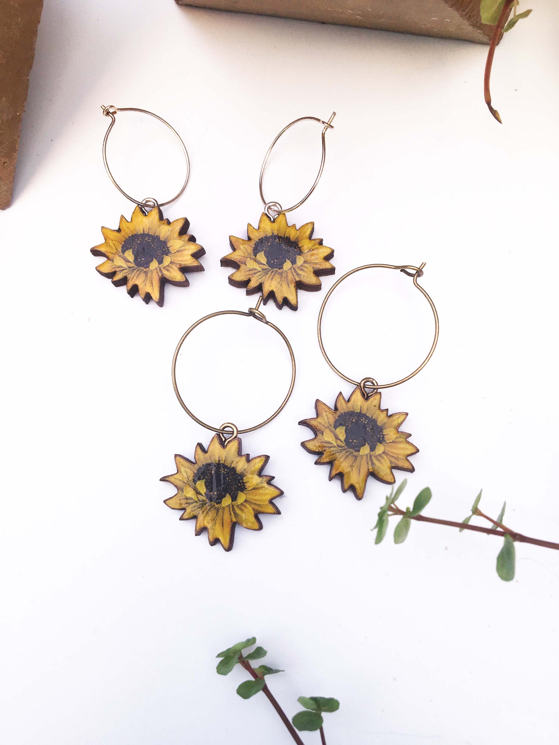 Every sunflower is finished by hand with a luxurious gloss sealant and can be strung on a variety of hoops (sterling silver, plated silver/bronze and goldfill) - your choice at checkout.