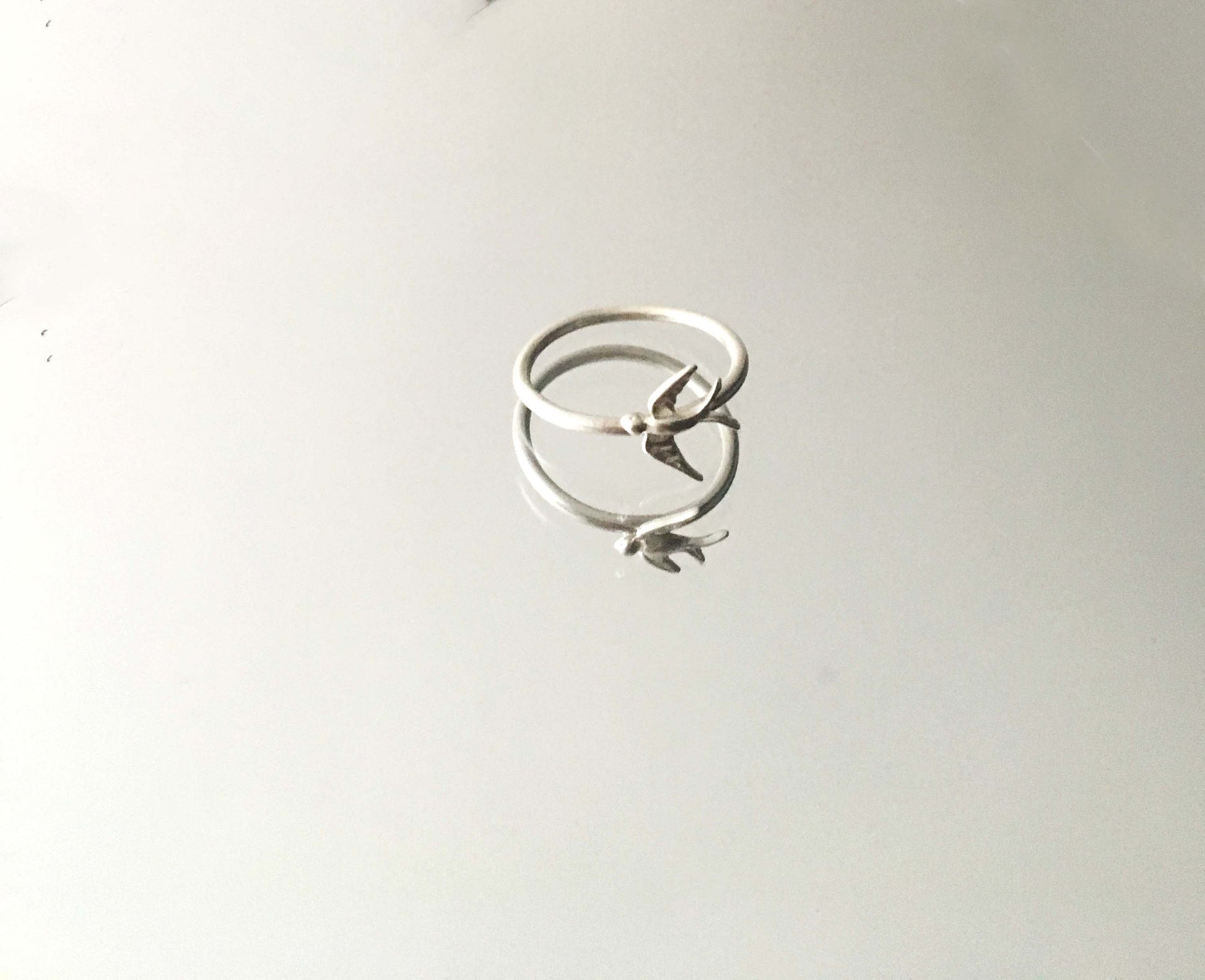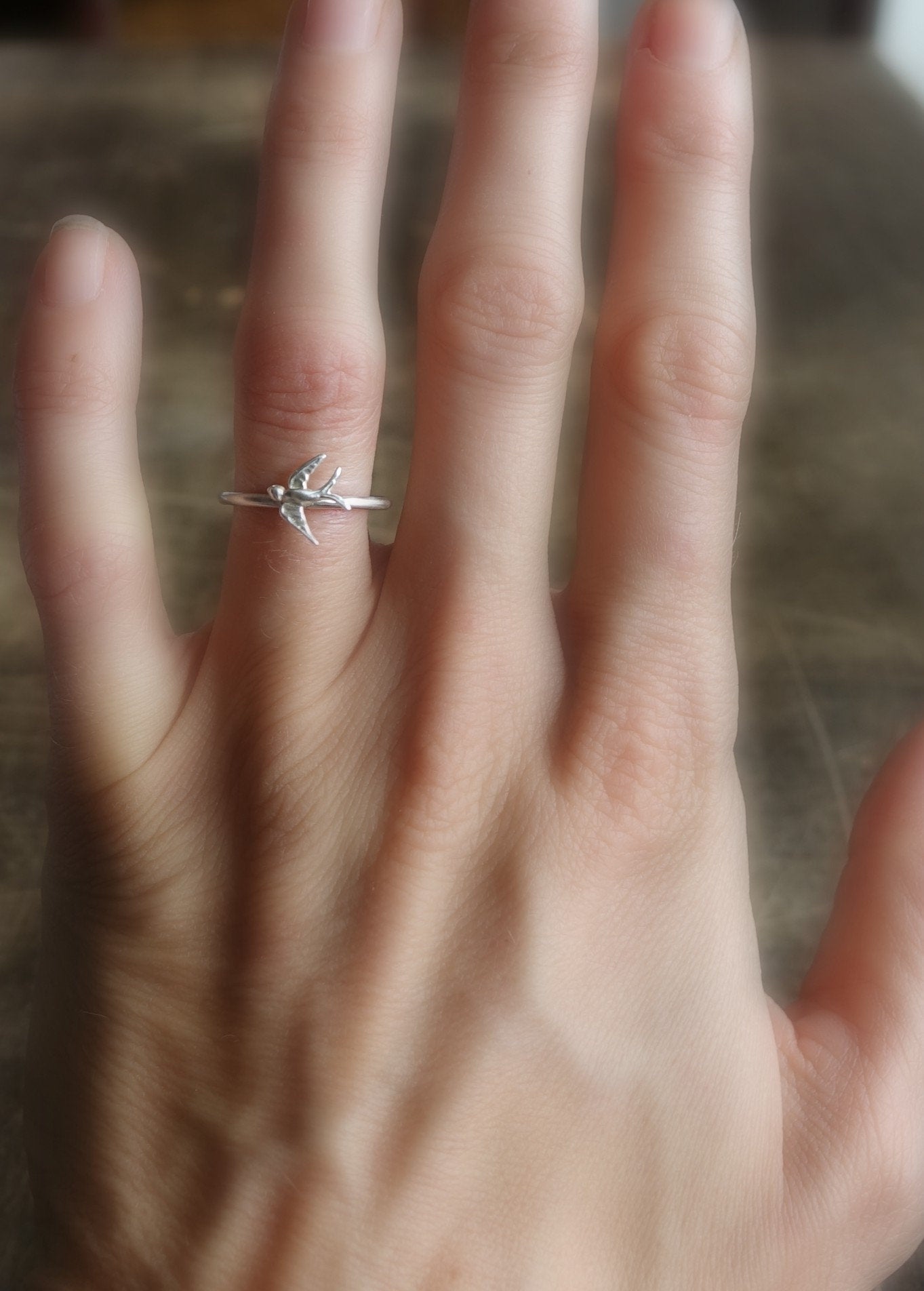 Fen & Co handmade eco sterling silver swallow ring made in my studio over looking the woods. One sweet flying swallow on a 1.5 mm 100% recyled sterling silver band