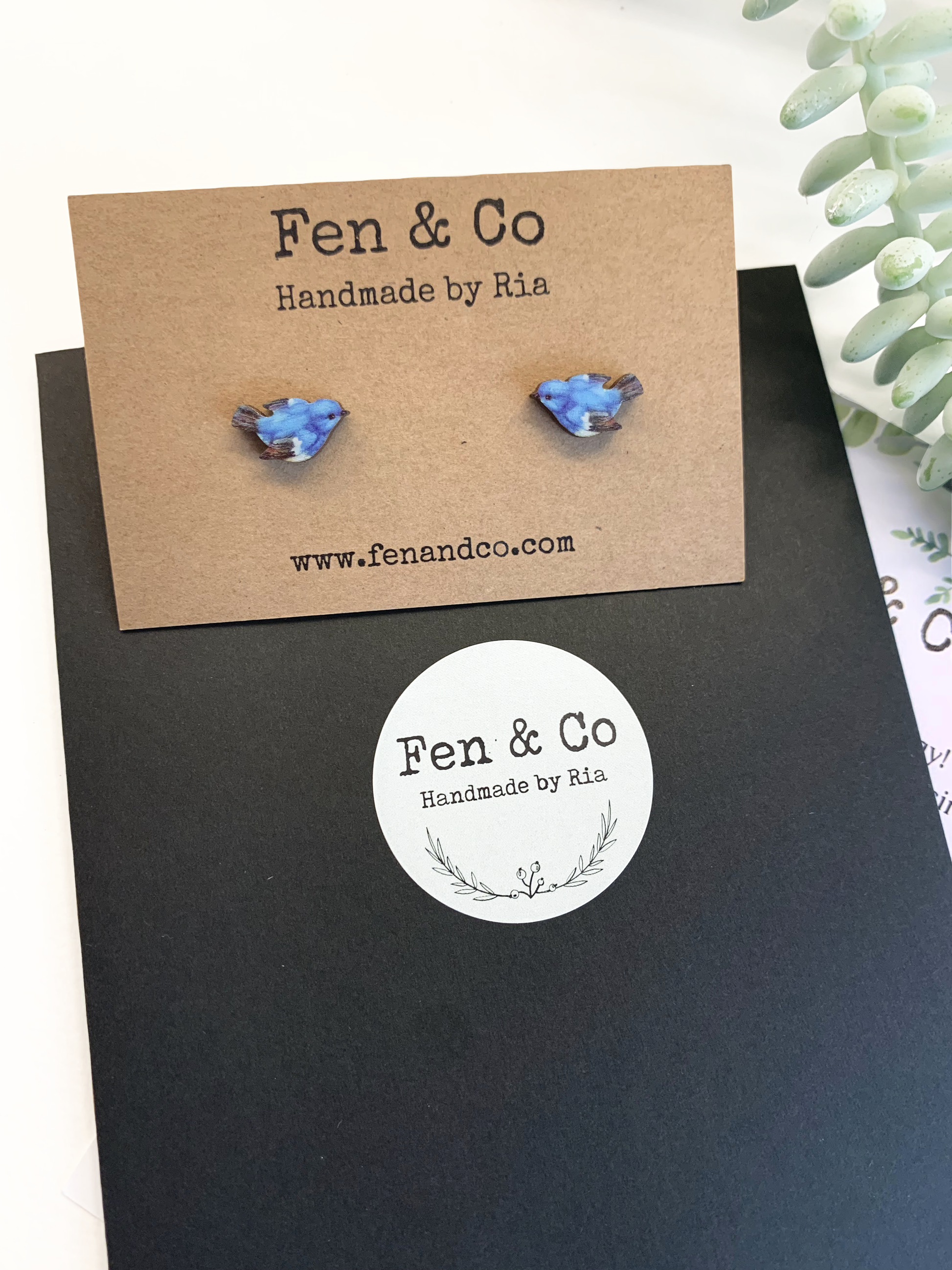 Each little bird is printed onto 3 mm thick FSC accredited Birch wood and a ear post of your choosing glued firmly to the back. The front are hand glossed giving an enamel look to the earrings.