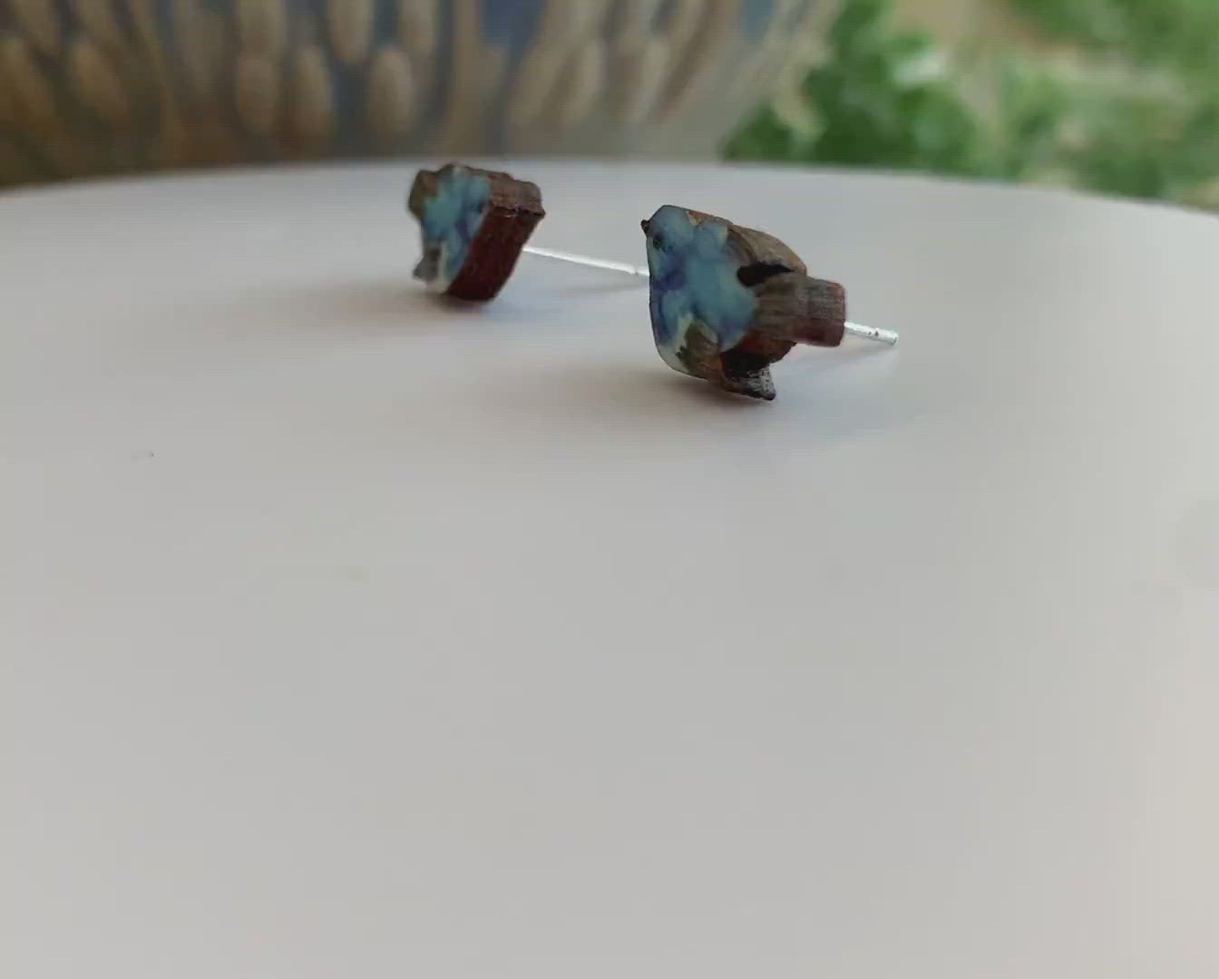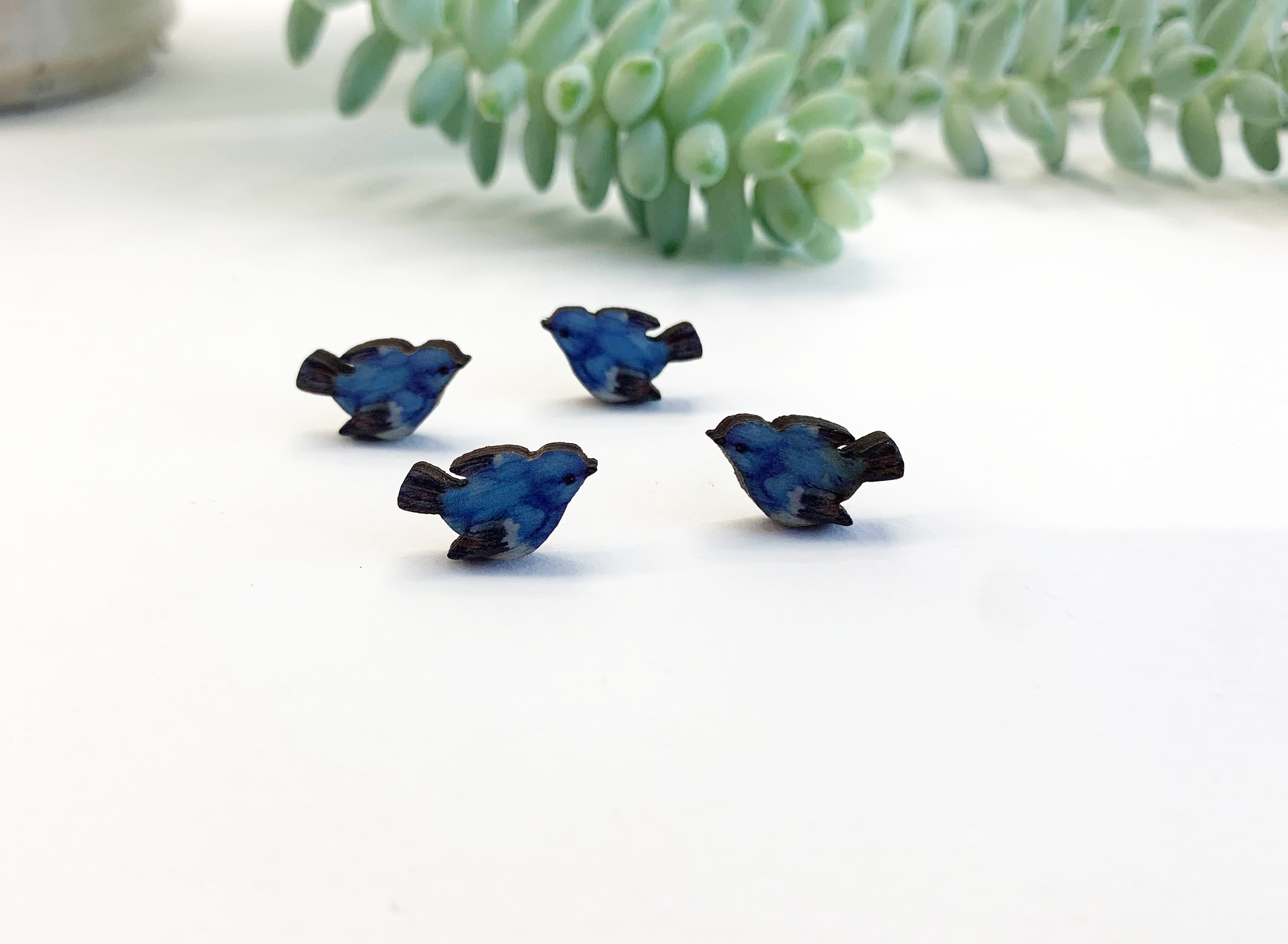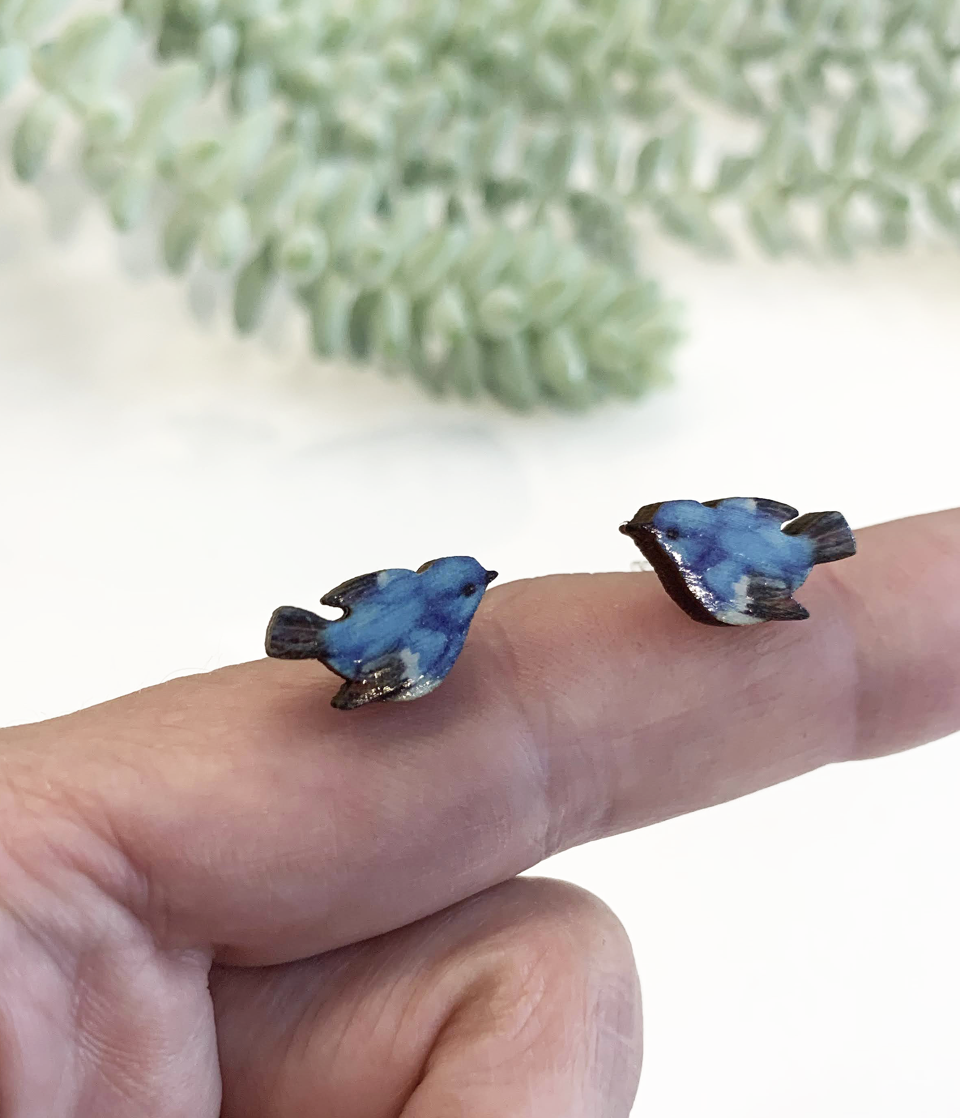 New! Tiny blue bird earrings made from a restored vintage image and sustainably grown Birch wood.
